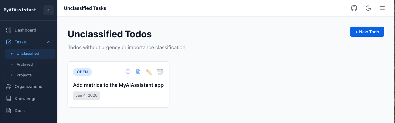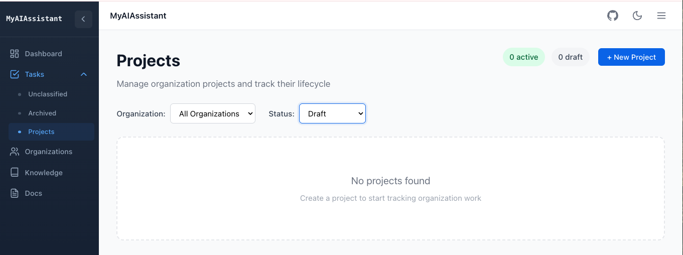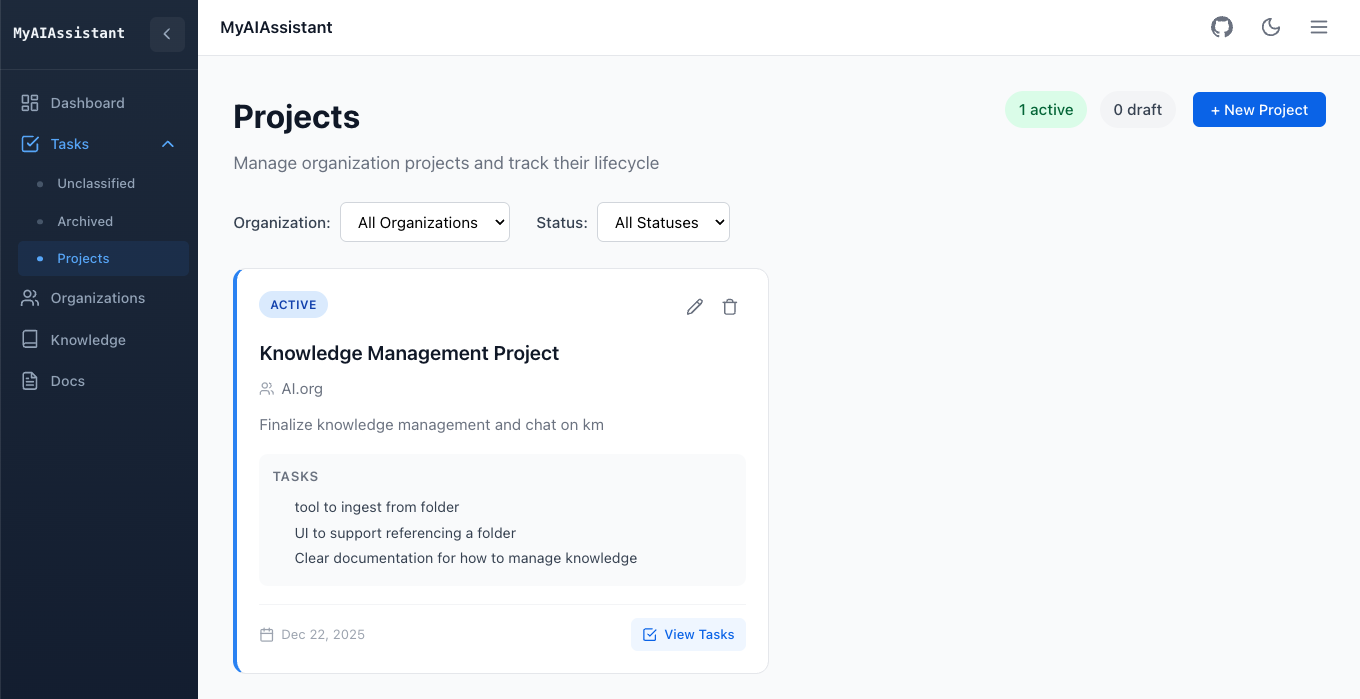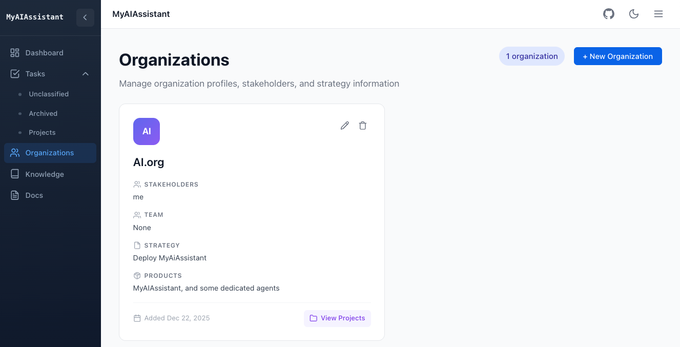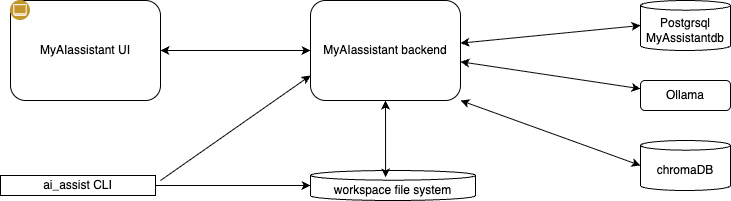 This guide covers how to use the main features of MyAIAssistant. As a web application, the configuration is set using a config.yaml, to specify where to access the database for the main entities, like tasks, organizations, documents, and where to access the vector store to keep document chunks and embeddings.