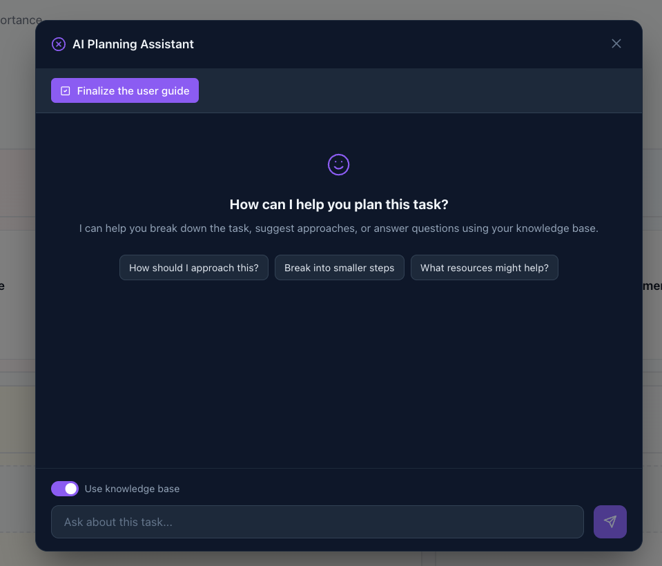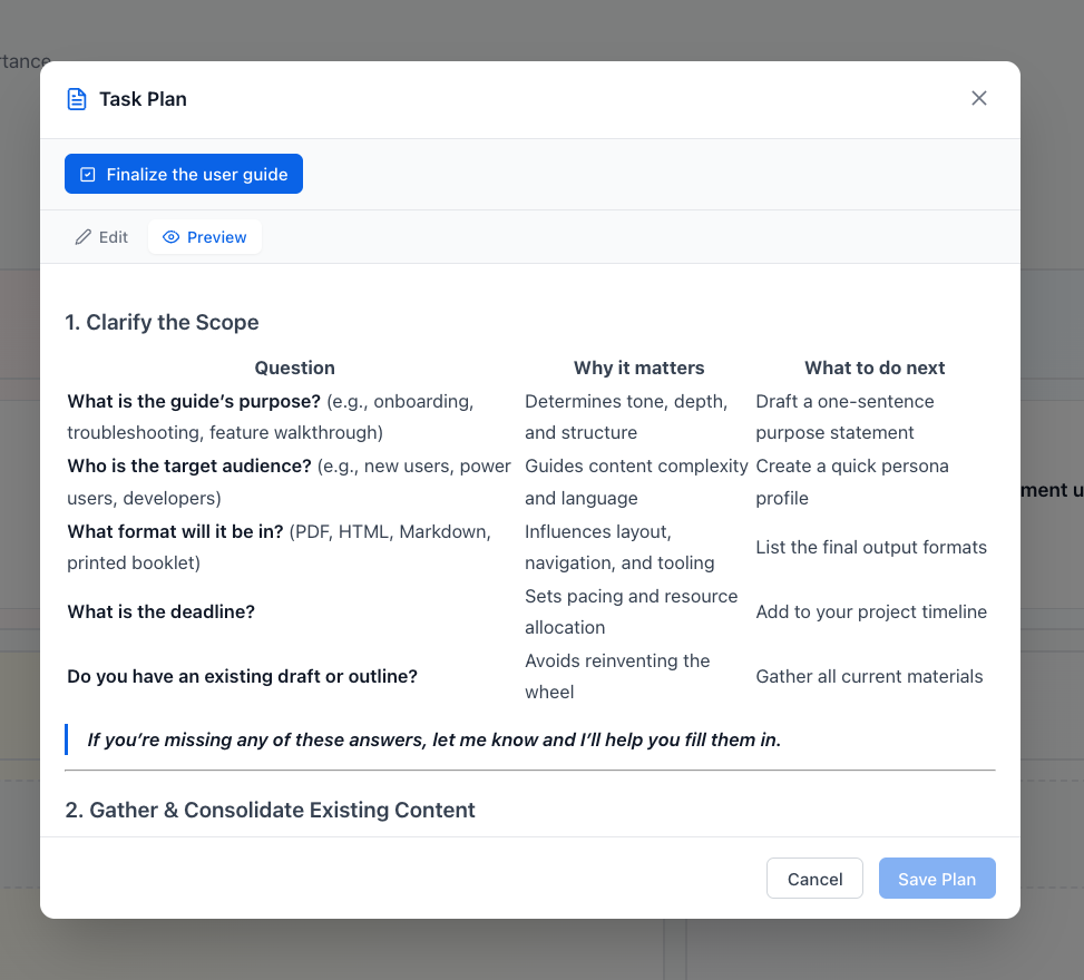 At the task level, it is possible to access to a plan, elaborated by the AI. At the task tile, select the document icon, then the task plan is displayed using markdown layout, and can be edited.