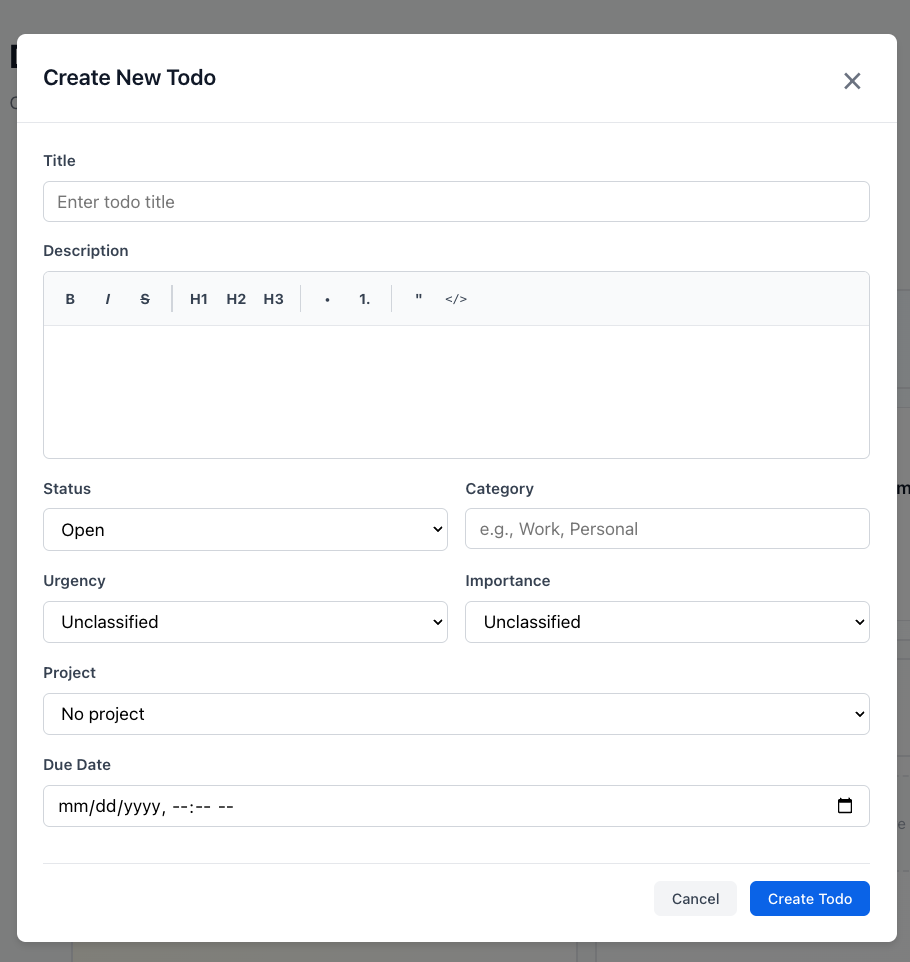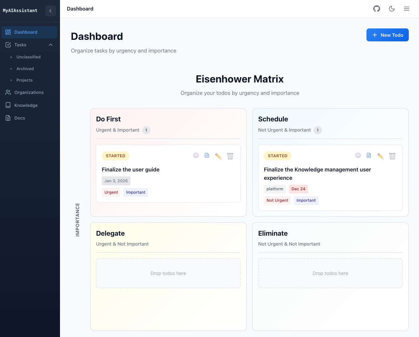 The Dashboard displays Todos/Tasks in a 2x2 matrix based on urgency and importance: