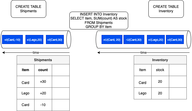 The following diagram illustrates the main processing concepts: the shipments table tracks product shipments, while the inventory table maintains the current quantity of each item. The INSERT statement processes streams to update the inventory based on new shipment records. This SQL statement uses the SUM aggregation operation to count each item, with the records grouped by item name.