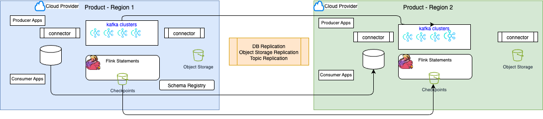 The approach is to have two identical Flink jobs or pipelines of jobs run in parallel continuously in both regions. They process the same data, with some replication delay in the secondary region.
