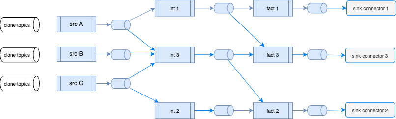 The following figure illustrates the Flink statements processing data across source, intermediate, and fact tables.